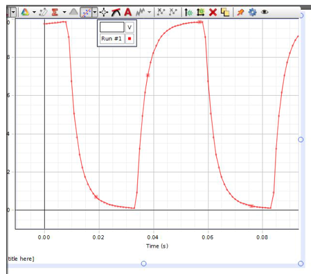 When show coordinates is active, a read-out of the voltage and time is displayed wherever you drag it, as in Fig. 11. Using this tool, determine and record the starting time (i.e., when the trace started upward from 0 volts) on the worksheet.