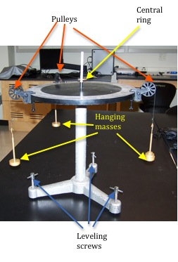 Given two force vectors you will determine the third force that will produce equilibrium in the system. This third force is known as the equilibrant and it will be equal and opposite to the resultant of the two known forces. You will use a force table as shown in Fig. 9, and work with force vectors. The force table is a circular platform mounted on a tripod stand. The three legs of the tripod have adjustable screws that can be used to level the circular platform. The circular platform has angle markings, in degrees, on its surface. Two or more pulleys can be clamped at any location along the edge of the platform. In this lab we will use three pulleys. Three strings are attached to a central ring and then each string is passed over a pulley. Masses are added to the other end of the strings.