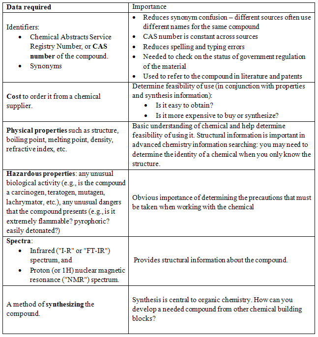 View the Literature Search video that shows you the process step by step. You will pick a compound to research from the list at the end of this chapter. Starting only with the name, you will try to find all pertinent data, listed in the table below. All of this information would be important if you were to use the compound. The remainder of this chapter discusses how chemistry information is produced, why each of these pieces of information are necessary, and how to find them.