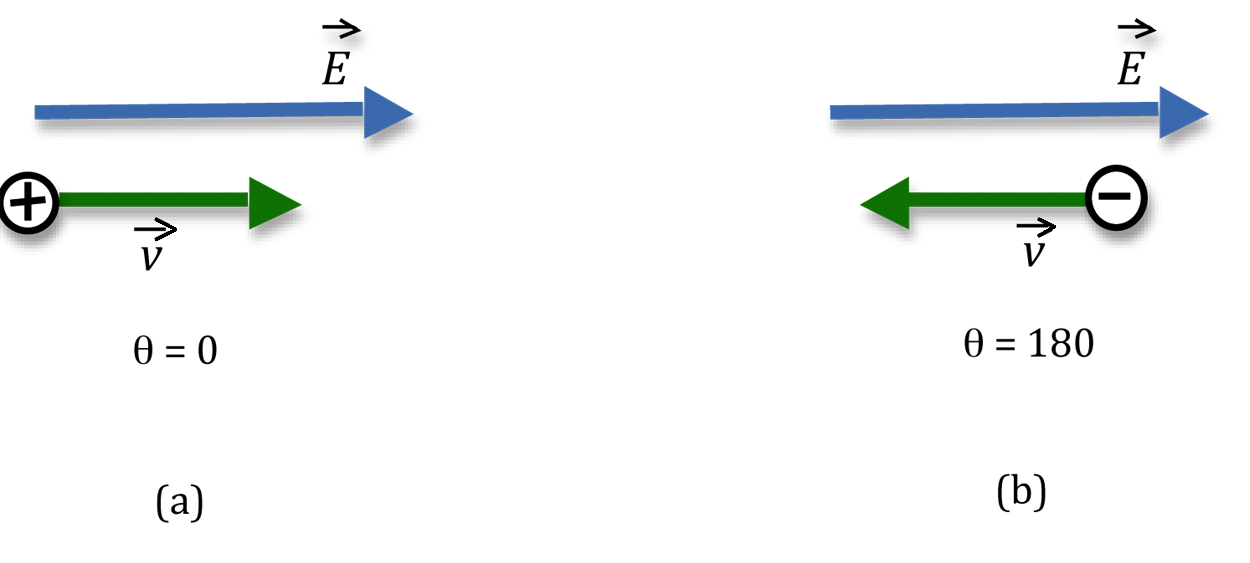 A positive charge placed in an electric field will tend to move in the direction of the field. The work done by the electric field in this case will be positive as the field and the displacement vectors are in the same direction and the dot product of the two vectors will be positive as shown in Fig. 1(a). Note that the velocity vector indicates the direction of the displacement vector for the charge.