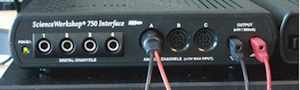 Insert the voltage probe (the plug with a red and a black lead) into the analog channel A of the PASCO ScienceWorkshop 750 interface and connect two wires to the output of the interface.