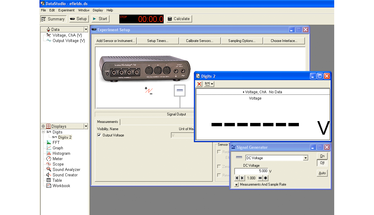 Fig. 8 shows the opening screen in DataStudio. You will see the "Experiment Setup" window, the "Signal Generator" window and the "Digits" window.