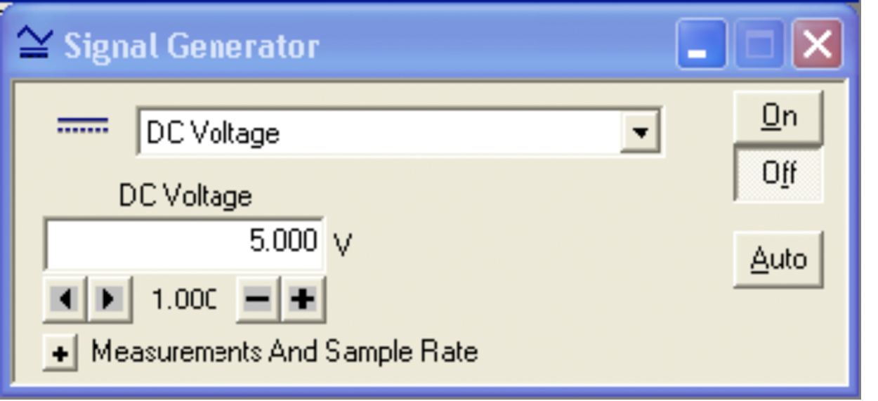 The "Signal Generator" window is shown in Fig. 9. Make sure the DC button of the icon is not already highlighted. Set the DC voltage to 5 V using the + and – buttons (+ to increase the value and – to decrease the value) to the right of the voltage setting.
