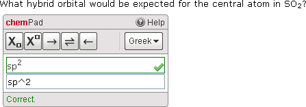 Orbit lets your students use variants for orbital hybridization, for example, dsp3 or sp3d, that are considered equivalent.