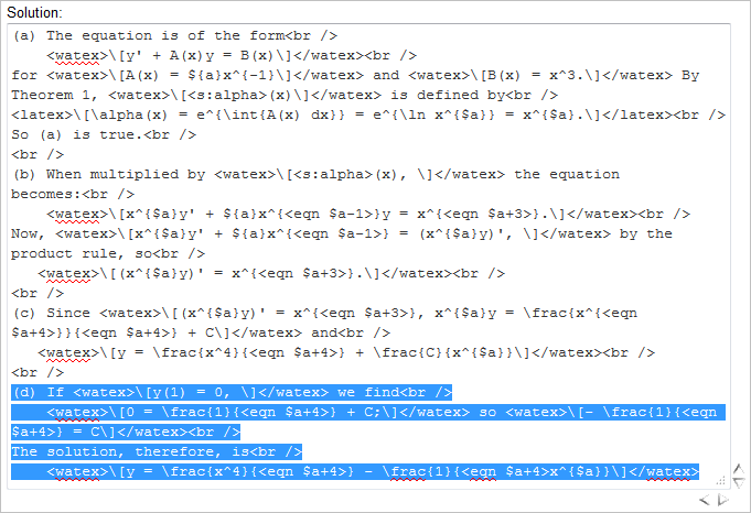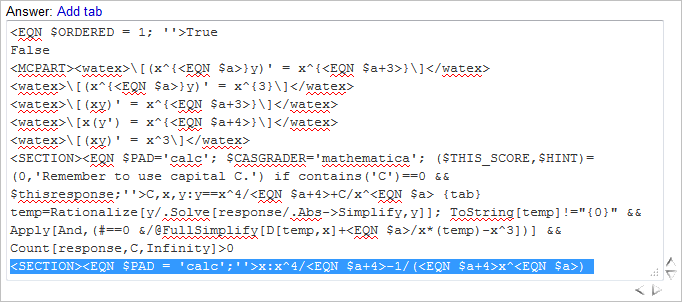 EQNtag and corresponds to one answer blank in the order they are displayed in the question. Make sure that you delete the entire line and there are no extra carriage returns at the end. Unless the deleted line is the lastEQNline, make sure theEQNtag is at the beginning of the next line.In the example, the highlighted text shows the Answer field part of GAM-RogaCalc2 10.4.001. that must be deleted because it corresponds with the deleted Question field part in part (a):