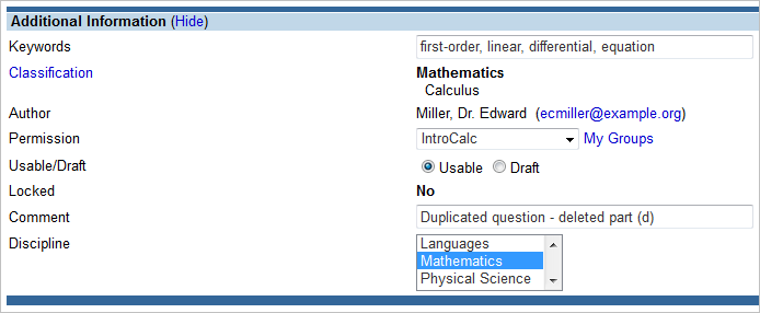 - Select Usable if the question is ready to be included in assignments or Draft if it is still being edited. Draft does not prevent the question from being included in your assignment; however, the question will not be available to anyone you chose to share it with until it is marked Usable.