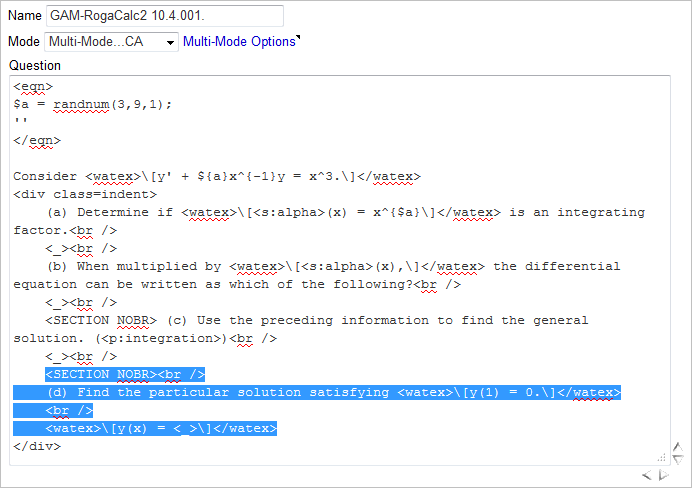<SECTION>or<SECTION NOBR>tags in the Question field must match the number of<SECTION>tags in the Answer field. Ensure you have edited the multi-mode settings, as described in Step 6, to delete the modes that correspond to the answer blanks you deleted.In the example, the highlighted text shows the Question part of GAM-RogaCalc2 10.4.001. that will be deleted: