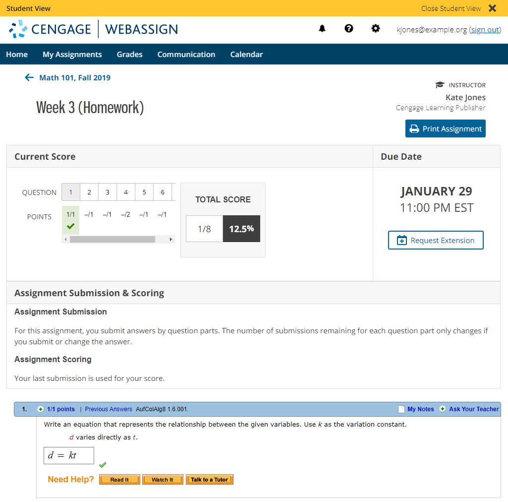 The My Assignments page opens as your students see it. If you have started or completed any assignment as a student, your scores and progress are displayed.