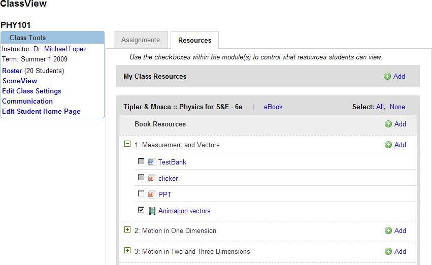 View Resource Materials for a Textbook eBooks and Resources > Use Textbook Resource Materials After creating your course, you can view the resources that are available for your selected textbook. Open the My Classes page. Click Classes > My Classes and find the section you want. Click the Resources tab. If the textbook you are using provides resources, those resources are listed below My Class Resources under a heading that identifies the textbook. Usually, textbook resources are organized by chapter. Resources are listed with icons representing common file types. To expand a chapter and see its available resources, click . To collapse an open chapter, click . To view a resource, click its title. Depending on your browser settings, you might have to choose to save or to open the resource. More information Make Textbook Resource Materials Available to Students Remove Resource Materials