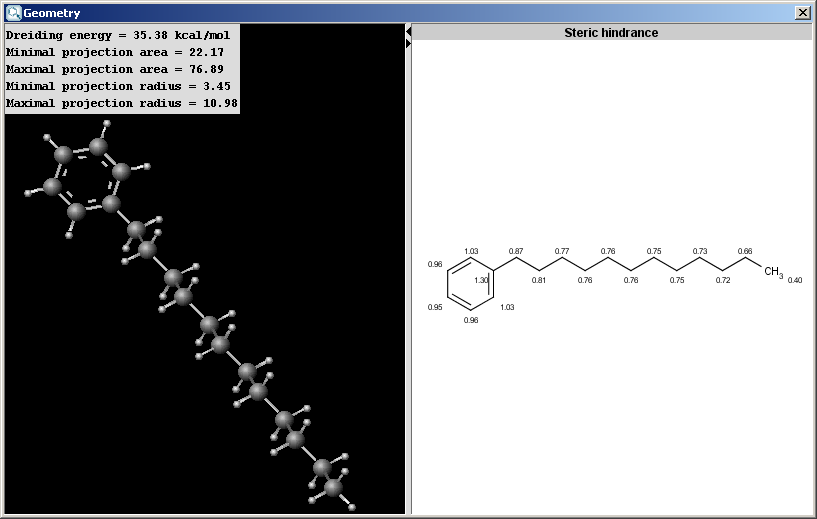 geometrical structure of a molecule. It can calculate steric hindrance and Dreiding