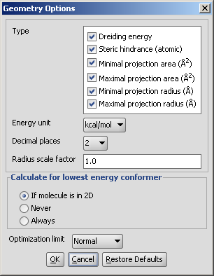 - If molecule is in 2D: the lowest energy conformer of the 2D molecule is generated, and its parameters