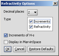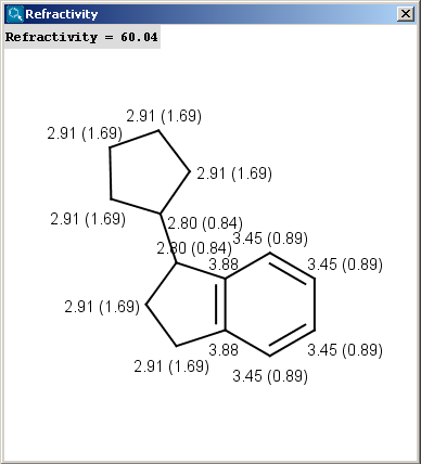 The result appears in a new window, containing a text field with the value of refractivity (dimension: 106⋅[m3⋅mol-1] and the molecule in 2D or 3D view: