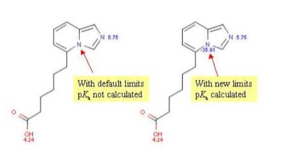 When an ionizable site in the molecule has very weak basic or acidic character, this can be accomodated by increasing the calculation range.