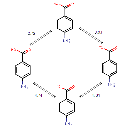 The ionization steps of p-amino benzoic acid are outlined below. Calculated micro