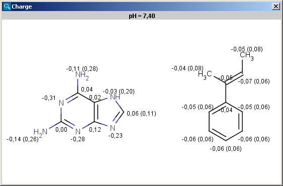 Charge is expressed in atomic unit [e].The numbers in brackets refer to the charge sums of implicit hydrogen atoms, and displayed only if the "Increment of Hs" option is switched on in the Charge Options panel.
