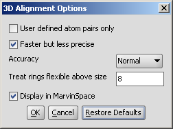3D Alignment tries to maximize the overlap of atoms of the same type of different molecules. Extended atom types are assigned to each atom to enable chemically more relevant atom pairing. For instance, aromatic nitrogen atom is not matched against a tertiary amine. Types differentiate atomic number, hybridization state and aromaticity, eg. ethene and benzene cannot be aligned. (These extended atom types correspond to the ones used in Dreiding force field.)