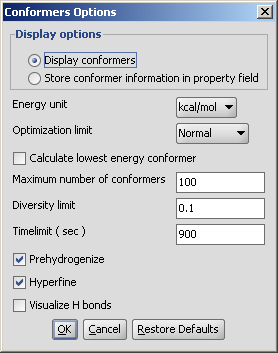 Calculate lowest energy conformer: calculates and displays only the lowest energy conformer structure. When checking this option, max. number if conformers and diversity limit are disabled.