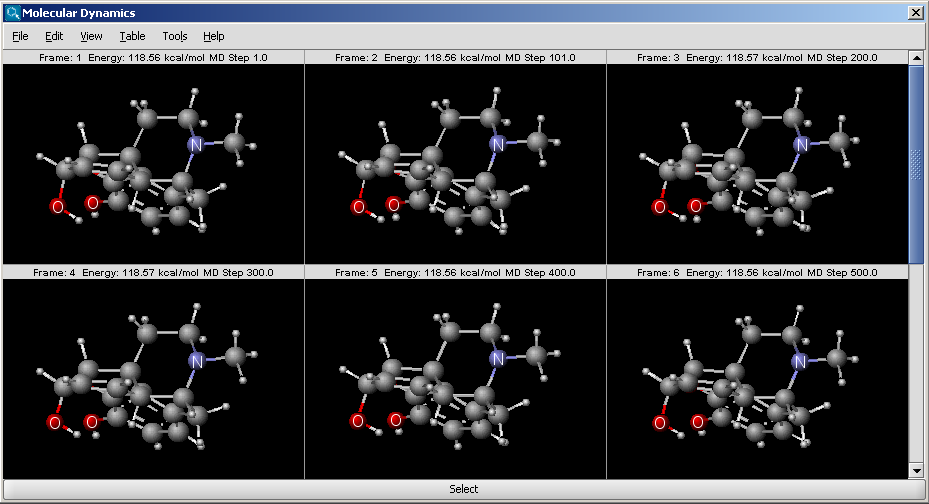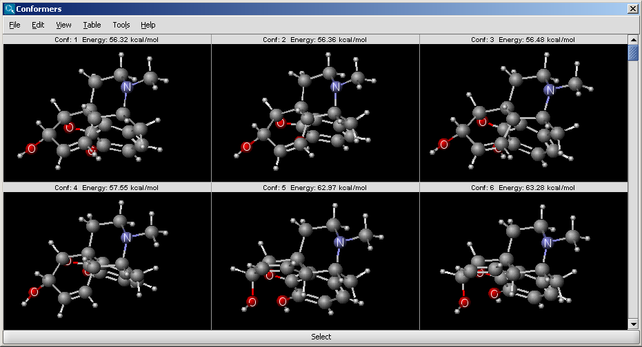 The results appear in a new window, containing all calculated conformers with their energy indicated: