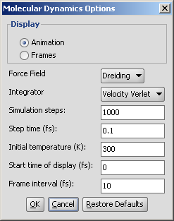 The calculation and the display options can be set in the Molecular Dynamics Options panel: