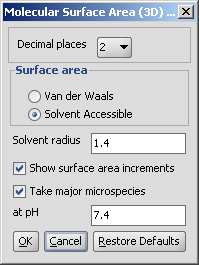 The calculation and the display options can be set in the Molecular Surface Area (3D)