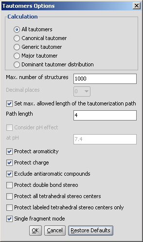 Tautomers of a compound can be determined with the help of the Tautomerization plugin. Following options can be adjusted in the Tautomers Options panel: