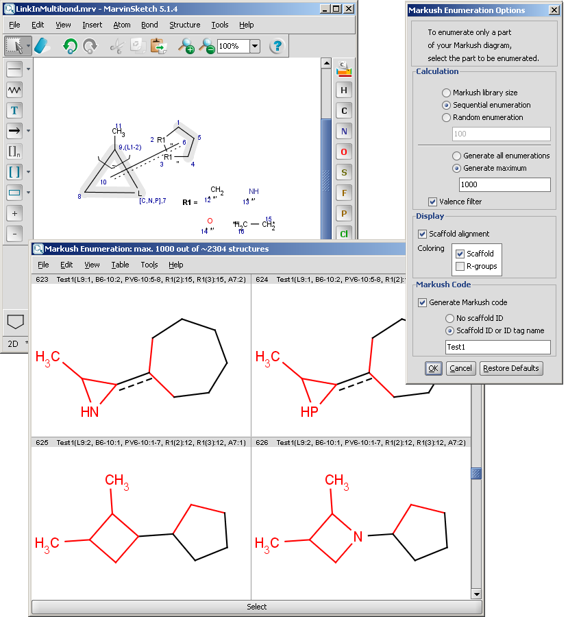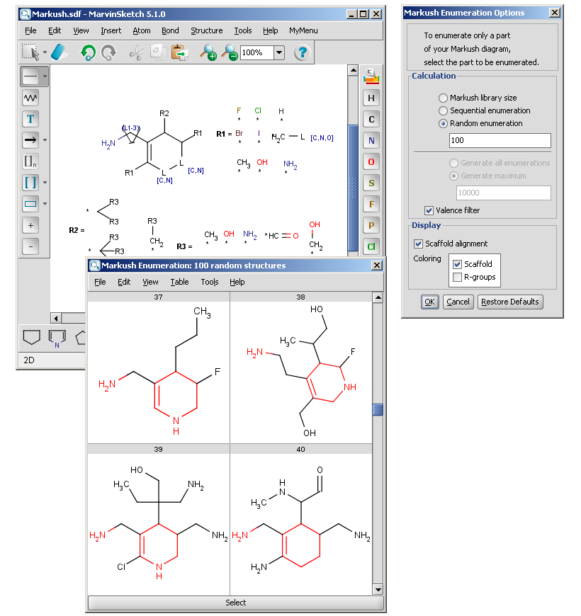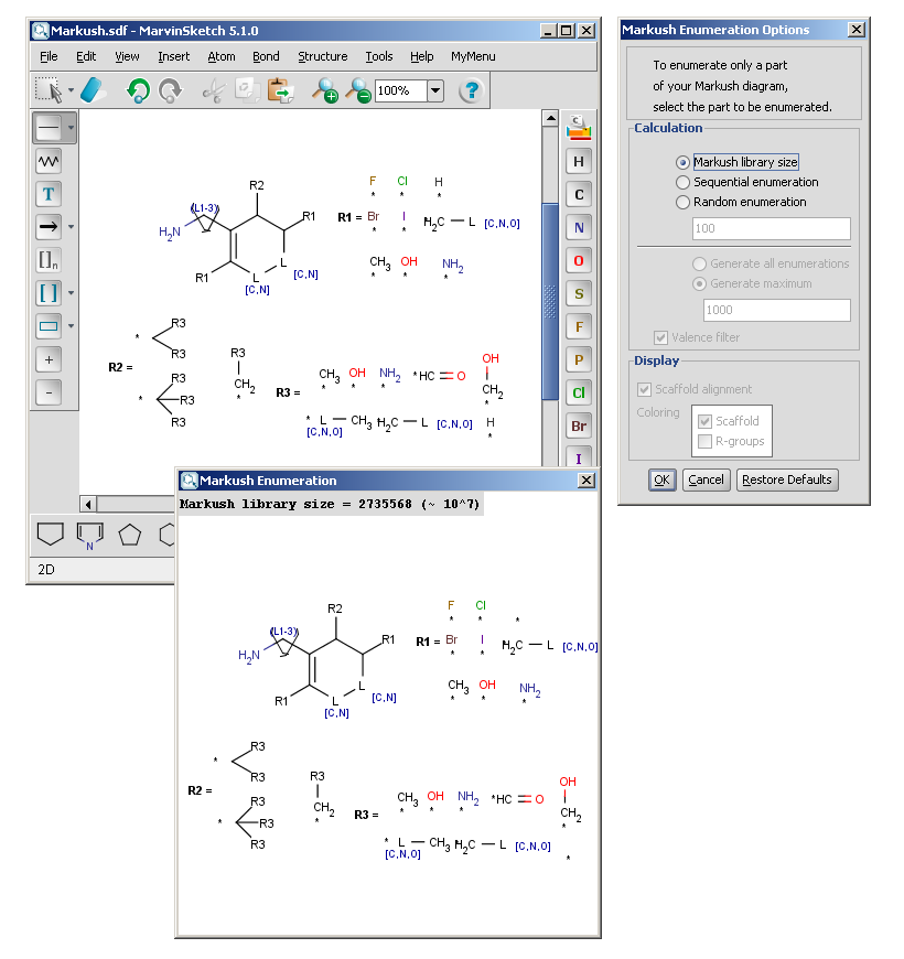 The Markush enumeration plugin can be used to generate a whole or a subset of the library of a generic Markush structure. It is also capable of calculating the total number of specific structures present in a Markush library. The plugin is accessible from the Marvin GUI (Tools->Markush Enumeration), through the cxcalc command-line program (See this link for the detailed usage of the plugin in command line.), via API and in the Chemical Terms functions in JChem.