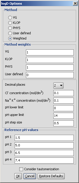 pH limits, pH step size: defines the pH window in which the logD is calculated, with pH values starting from the lower limit incremented by the step size, the results given in table format and a chart.
