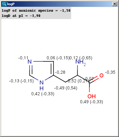 The result window shows the logP increments for each atom. The numbers in brackets refer to the logP increment sums of implicit H atoms, and displayed only if the "Increment of Hs" option is switched on in the logP Options panel.