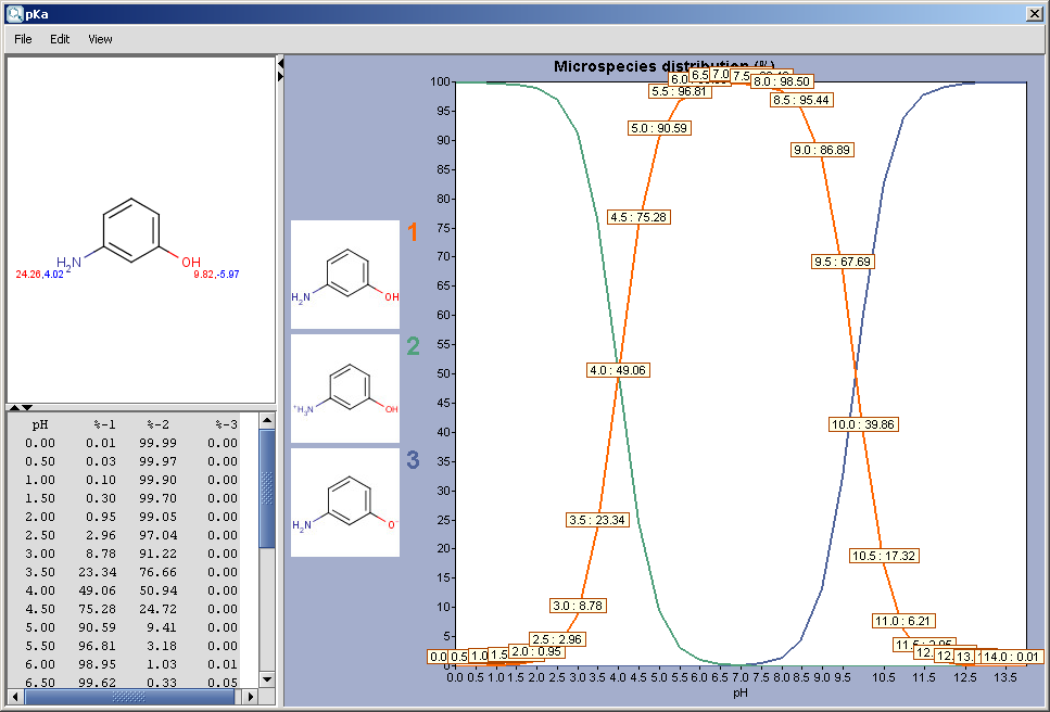 The chart shows the microspecies distribution curves vs. pH. The microspecies images are shown in the legend. When clicking on an image, the corresponding microspecies molecule is displayed in the upper-left viewer. (The viewer can be detached from the chart panel by double clicking in it, or else by selecting Open Viewer from the View menu.) The original molecule with the pKa values is shown when clicking on the chart outside of the legend image areas, or else when selecting pKa Values from the View menu.