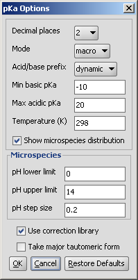 The pKa options panel offers different parameters to set: