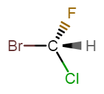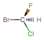 4 atoms arranged around a central atom with implied directionality: the central atom is a C atom; a Br atom left of center, and a Cl atom below center form a plane with the central atom; an H atom lies in front of the plane, and an F atom lies behind the plane