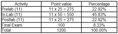 Each lab is composed of a prelab (25 points), InLab (50 points) and postlab (25 points). There is also a final exam (100 points). The typical semester grading components are shown below.
