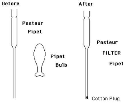 As mentioned earlier, when working with liquids on a small scale (e.g. 0.3 - 3.0 mL), it is never a good idea to pour! Too much material is lost by just wetting the glass. Furthermore, graduated cylinders are not at all accurate for such volumes. Syringes are excellent, but are expensive and easily broken. The standard "disposable" or "Pasteur" pipet is excellent for transferring small volumes of non-volatile liquids such as aqueous solutions. However, most organic solvents have a significant vapor pressure at room temperature. This causes them to "dribble" from the pipet as a transfer is attempted. To alleviate this source of sample loss, the standard pipet can be easily modified to produce an excellent means of transfer of these small quantities of organic liquids. It also provides an excellent method of filtering small quantities of liquid. We will call the modified pipet a "Pasteur Filter Pipet ". All that is required is to place a very small piece of cotton in the tip of the pipet. This technique is sort of an "art" and requires a few trials to get it right. However, once the technique is learned, a new Pasteur Filter Pipet can be prepared in about 30 seconds.Procedure