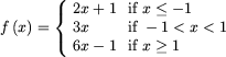| Formula | 'f(x)={(2x+1 text(if) x <= -1,3x text(if) -1 < x < 1,6x-1 text(if) x >= 1)' | ![]() |