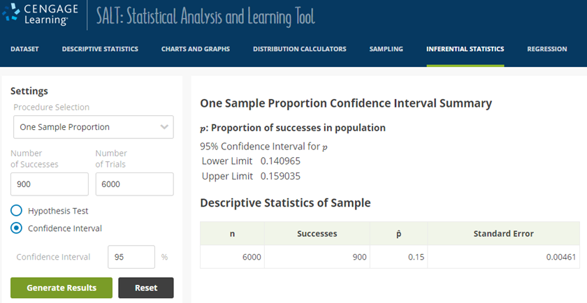A screenshot of the SALT program is shown. On the menu bar at the top of the page, the tab labeled "Inferential Statistics" is selected. A partial view of the Inferential Statistics page is visible below, where a menu labeled "Settings" is shown on the left. In the Settings menu, a drop-down list labeled "Procedure Selection" has the option "One Sample Proportion" selected. Below the drop-down menu, two text entry boxes labeled "Number of Successes" and "Number of Trials" have the numbers 900 and 6,000 entered into them, respectively. Below the text entry boxes, a set of two radio buttons has buttons labeled "Hypothesis Test" and "Confidence Interval" with "Confidence Interval" selected. Below the radio buttons is a text entry box labeled "Confidence Interval" that has a percent sign following it and the number 95 entered into it. Below the text entry box are two buttons labeled "Generate Results" and "Reset." To the right of the settings menu is a data display labeled "One Sample Proportion Confidence Interval Summary" with text reading line by line as follows.