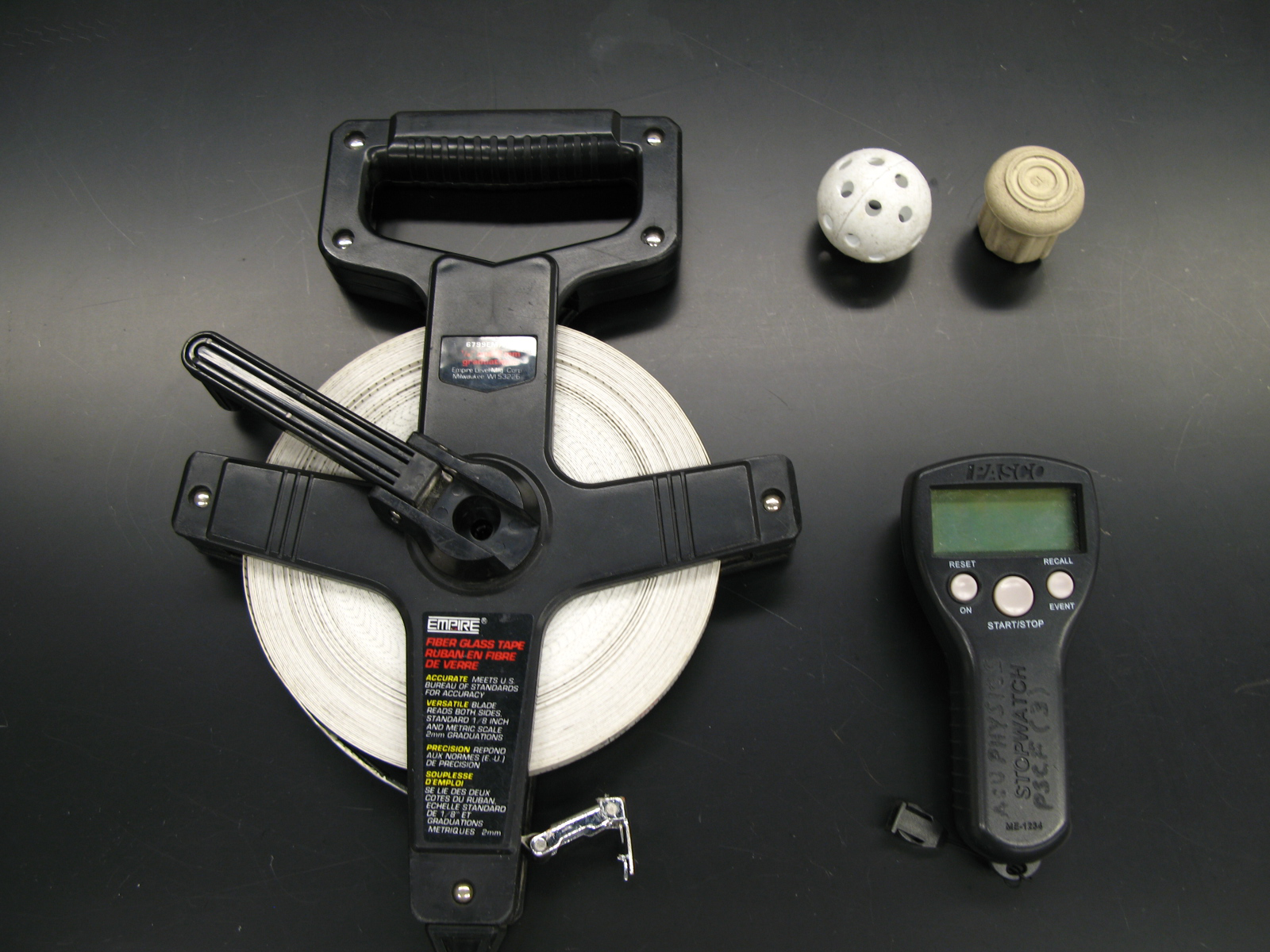 Drop a rubber object (provided) from the stairway of a building. Make sure that no one is directly below the object when it is dropped. Use a tape measure to determine the height y from which the object is released. Use the stopwatch to measure the time t it takes for the object to fall down to the ground. These measurements have to be repeated at least 10 times in order to get a reasonable value of t