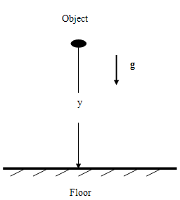 If air resistance is negligible, the motion of the object caused by the gravitational force is known as free fall. A free-falling object experiences a uniformly accelerated motion until it reaches its terminal velocity. Everything on Earth experiences gravitational acceleration from the Earth. The acceleration of a freely falling object, g, is constant and equals approximately 9.81 m/s2 near the surface of the Earth. Since free fall motion is uniformly accelerated motion, the equations of kinematics that describe uniformly accelerated motion can be used. Consider the picture in Fig.3, below. An object at rest is released from a position of y above the floor.