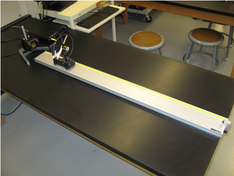 Place the constant speed buggy at the opposite end of the track from the motion detector. Using masking tape, make a mark on the track 20 cm away from the motion sensor. Turn on and hold the buggy. Start the program and release the buggy. Stop the recording when the buggy reaches a 20 cm mark.
