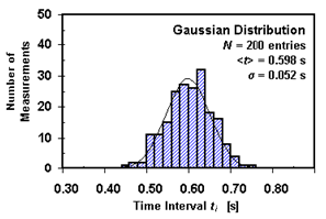 Physics is largely a science of measurements. Experience has shown that no measurement is exact. All measurements have some degree of uncertainty due to the limitations of instruments and the people using them. In science, it is critically important to specify that uncertainty and include its reliable estimate in the final statement of the result of the measurement. Two concepts associated with measurements are accuracy and precision. The accuracy of the measurement refers to how close the measured value is to the true or accepted value. For example, if you used a balance to find the mass of a known, standard 100.00-g mass, and you got a reading of 78.55 g, your measurement would not be very accurate. In general, the experimantal results are considered accurate if the percent discprepancy/difference is within 10–15%, depending on the experimental setup used to prove the theoretical concept. Precision is the degree of exactness or refinement of measurements. Precision has nothing to do with the true or accepted value of a measurement, so it is quite possible to be very precise and totally inaccurate. In many cases, when precision is high and accuracy is low, the fault can lie with the instrument. If a balance or a thermometer is not working correctly, they might consistently give a systematic error (inaccurate answers) resulting in high precision and low accuracy. In general, the experimental results are considered to be precise if the relative uncertainty is less than 5–10%, depending on the experimental setup used to prove the theoretical concept. One important distinction between accuracy and precision is that accuracy can be determined by only one measurement, while precision can only be determined with multiple measurements. A measurement can be accurate but not precise, precise but not accurate, neither, or both. For example, if an experiment contains a systematic error, then increasing the sample size generally increases precision, but it does not improve accuracy. Eliminating the systematic error improves accuracy, but it does not change precision. Commonly, the best estimate of the true value of the measured quantity x can be obtained by calculating the mean (average) value of some significant N number of measurements of that quantity repeated using the same equipment and procedures. In our experiment, it is assumed that the uncertainty in the measurements is due to the random errors. In such a case, the measure of the uncertainty (random error) in the mean value will be the standard deviation of the mean, called the standard error, which is the precision of the mean, where σx is a standard deviation that can be calculated using the following equation. The standard deviation is a measure of the precision of the measurement. It gives the probability that the experimental data fall within a certain range of the measured mean. Probability theory states that approximately 68.3% of all repeated measurements should fall within a range of plus or minus σx from the mean; 95.5% of all repeated measurements should fall within a range of 2 · σx from the mean. This distribution of the measurements can be displayed graphically in a histogram. A histogram is a bar graph in which the different measured values divided into convenient intervals (or bins), all of the same size, are plotted along the horizontal axis, and the frequency of their occurrence (number of measurements in each interval) is indicated on the vertical axis. As the number of measurements increases and the bin size decreases, the histogram becomes a quite smooth, regular, and continuous curve as shown in Fig. 2.