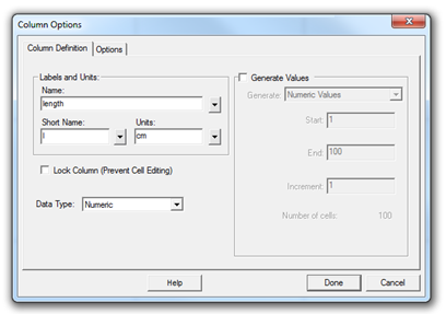 Open the Graphical Analysis (GA) program. The default file consists of a two-column table and a graph area. Double-click on the first column name and change its label to "length" with units "cm." In the same way, change the name and units of the second column to "width" and "cm," respectively.