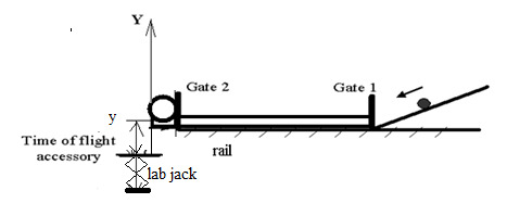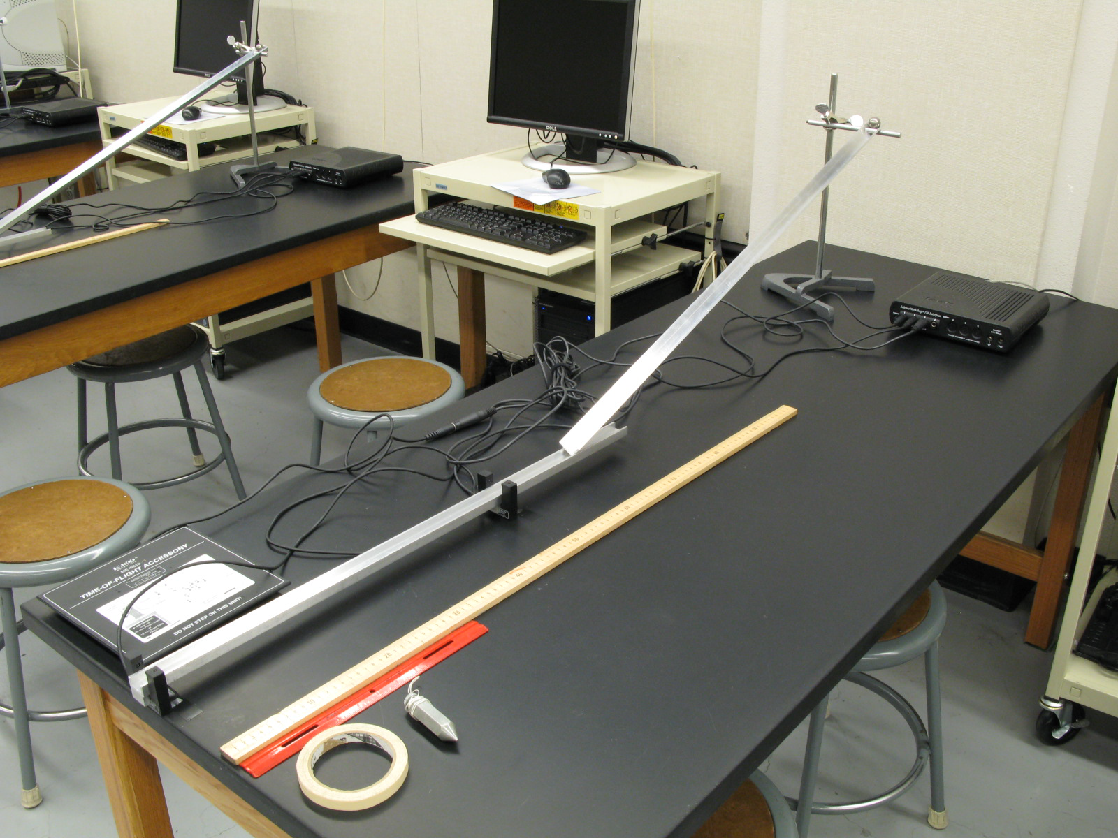 inclined plane, guided track, Science Workshop interface, photogates, time-of-flight accessory, lab jack, ball, metric ruler, plumb bob, masking tape