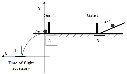 After the ball is launched, Data Studio will record the data automatically. Timer 1-2 (t12) in Column 1 is the time it takes the ball to roll between photogate 1 to photogate 2. Timer 2-3 (t23) in Column 2 is the time of flight. Photogate 2 registers the ball right before it is launched into projectile motion, and the time-of-flight accessory registers the time the ball lands. Column 3—Velocity in Gate— is a launched velocity, or, in other words, the initial horizontal velocity (vx) of the projectile object.