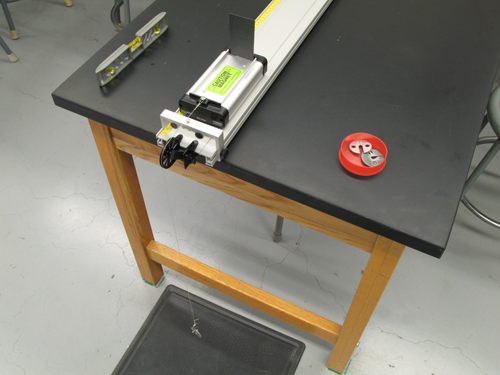 horizontal dynamic track, PASCO pass-cart, motion sensor connected to the Science Workshop Interface, lab stand, balance