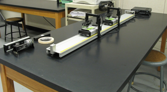 horizontal dynamics track, collision and dynamics carts with picket fences, photogates connected to the Science Workshop Interface, level, additional weights (masses)