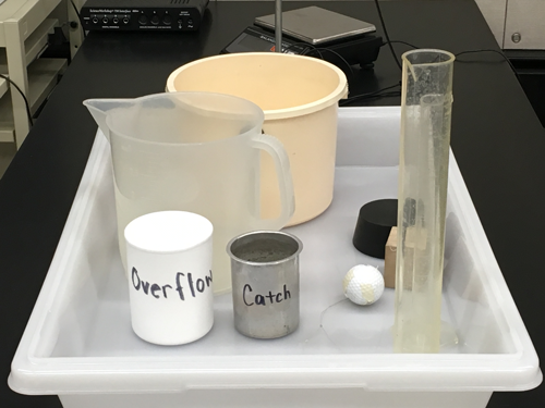 force sensor, a beaker, a graduated cylinder, electronic balance, string, masking tape, overflow can, catch can, different objects (wood cube, rubber stopper, golf ball), water, rods and base, GA software