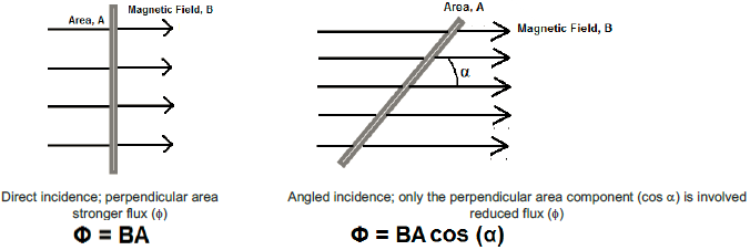 Magnetic flux is how a material is affected by a magnetic field. An analogy would be how light from the sun affects materials, like you. Whether or not you will get sunburned is determined by the intensity of the sunlight, which in turn is a product of two key factors (other than covering): the amount of incident sunlight and the angle at which it strikes you. A strong beam of sunlight directly on your outstretched arm can create a warm or hot feeling rather quickly. The effect is that you get sunburned more readily when the sun is highest in the sky and shining directly down onto you (greater intensity because the light is striking you at close to a 90° angle—shoulders, top of your head, nose, etc.). However, when that same incident beam of sunlight strikes you at an oblique angle, the area the beam covers is larger, thus reducing the intensity. The effect is that you do not normally get sunburned in the late afternoon. Similarly, the magnetic flux (relating to change) is the product of the strength of the magnetic field and the surface area perpendicular to it. However, unlike the sunlight example, we are looking for a change in the magnetic flux, which can be produced by a change in either one of these two factors. A constant magnetic field on a constant area will not produce a current (as Faraday discovered). Either the magnetic field must change—increase, decrease, or flip polarity—or the surface area of the material perpendicular to the field must change—increase or decrease. Note: Changing the angle of the material changes the angle of incidence of the magnetic field and thus changes the perpendicular surface area.