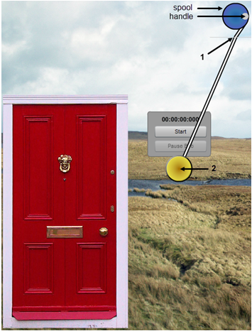 A measuring tape and protractor allow you to measure the length of the pendulum and the (angular) amplitude of its motion. Try them by clicking in their check boxes. Leave the measuring tape on. Rotate the handle on the spool to change the length of the pendulum. The length is measured from the top end of the moving part of the string, the point of attachment, point 1, to the center of the bob, point 2.