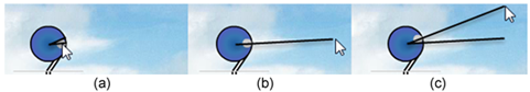 Adjusting the pendulum length with any precision seems difficult at first, but there's a trick which works with our apparatus. Suppose you need to make a slight adjustment in string length. This requires that you turn the spool through a small angle as shown in Figure 4a. On your screen this means that you need to move the pointer just a few pixels which is very difficult to do with a mouse. Being off a pixel or two results in a large difference in angle and string length. Try this instead. Click on the handle and drag your pointer to the right as shown in Figure 4b. Then drag upward as shown in Figure 4c. The knob has now been turned through the same angle as in Figure 4a, but at this greater radius, being off a pixel up or down corresponds to a much smaller change in spool angle. You've effectively made the spool much larger in radius. You can actually go all the way to the edges of the screen, even outside of the browser window or onto another monitor!