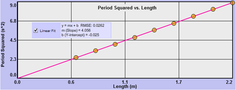 Historically, with this apparatus typical values for b and RMSE are b = ±0.025 s2 and RMSE = ±0.030 s2, which would indicate that the y-intercept can be ignored. If your value for either b or RMSE is significantly larger then these, it would be good to carefully retake your data. For what follows, we'll assume that you've found acceptable data. Thus we're assuming that item b is correct in this case.