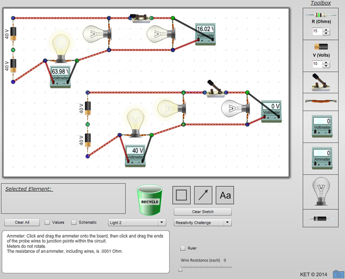So what's with the numeric steppers in the Toolbox and below the circuit board? The ones in the toolbox preset the voltage or resistance of a battery or resistor that you then want to drag onto the circuit board. The ones below the circuit board change these values for a battery or resistor that you select on the circuit board by clicking on it. The ones in the toolbox set the values for a battery or resistor that you will then drag onto the circuit board.